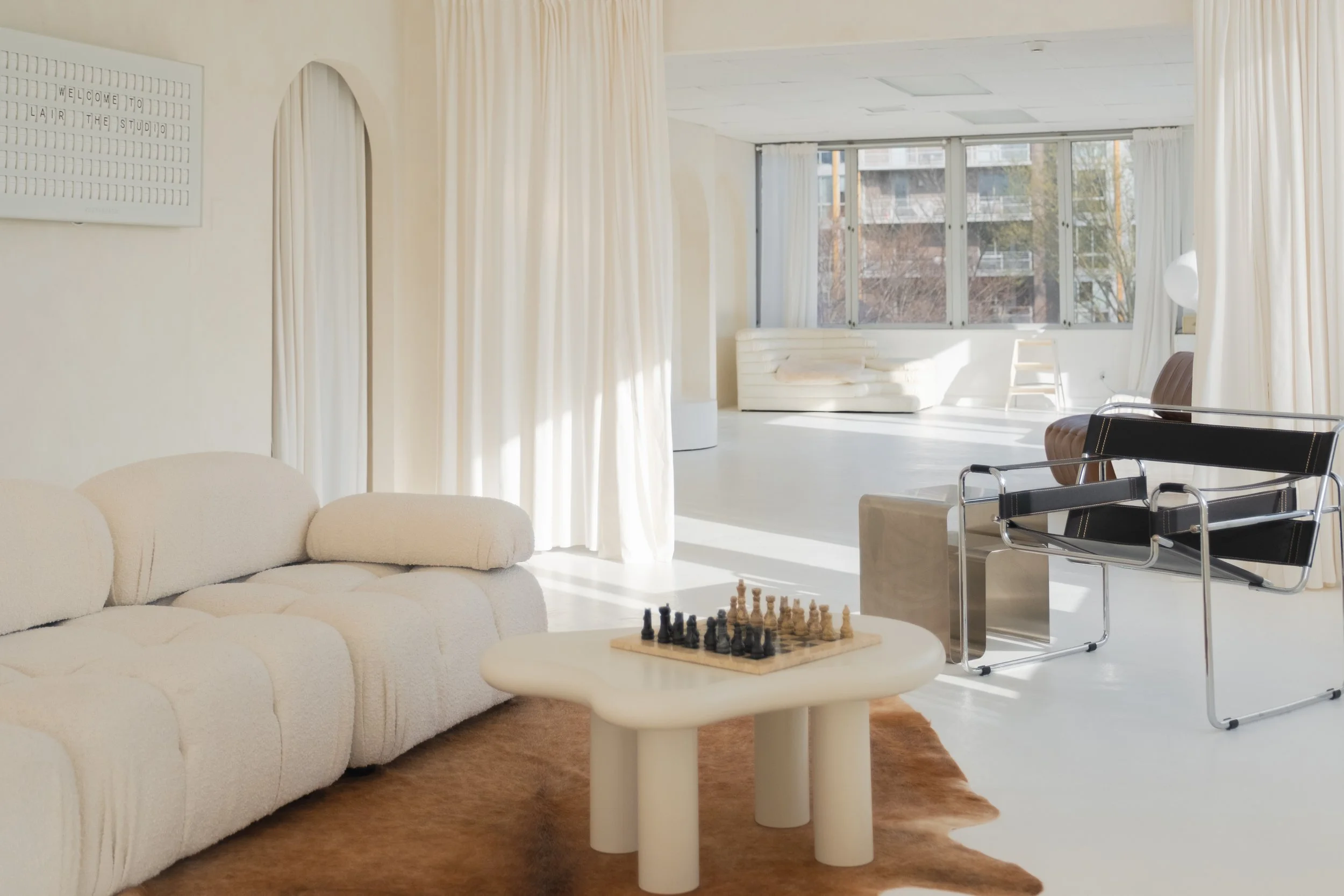 The LOUNGE mimics the cozy living room and beauty aesthetic— drowned by natural lighting all throughout the day. Furnished with a luxury boucle sofa, leather togo chair, a beauty table, and a living room setup for your aesthetic needs.
